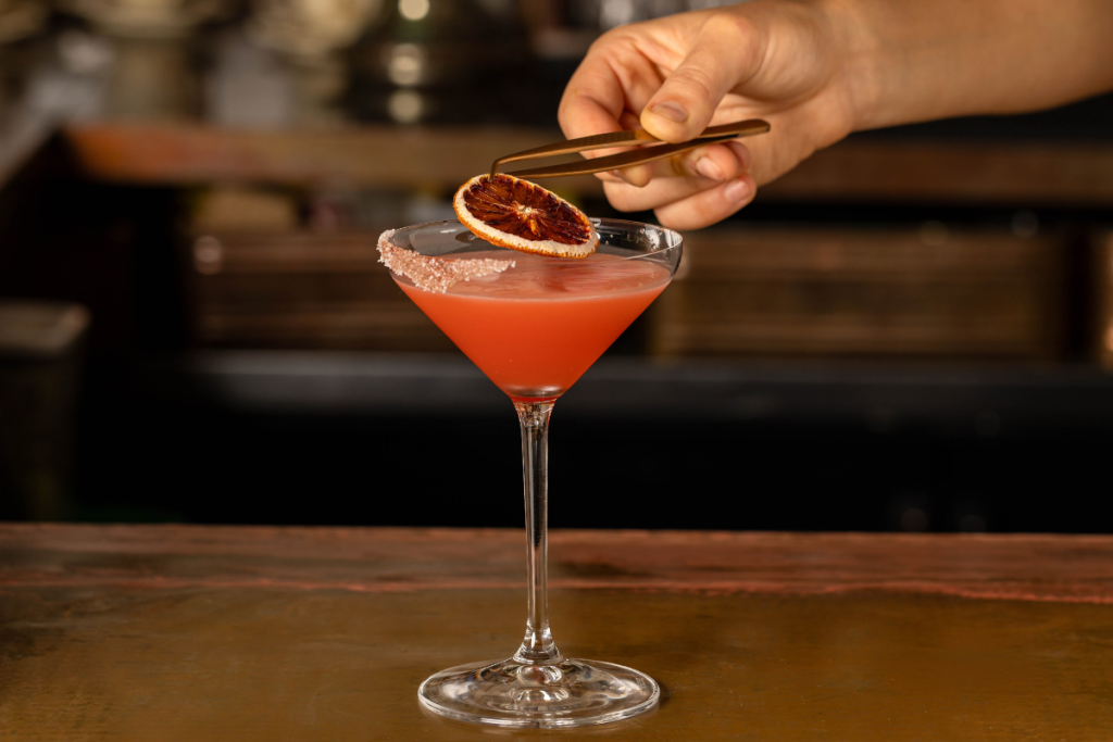 - Garnish with a single dehydrated orange blossom or a strip of blood orange peel.