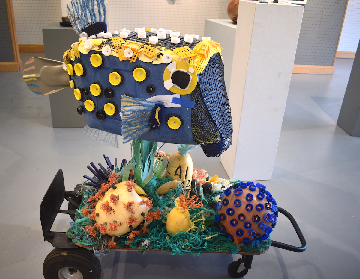 “It’s all about the creativity of these artists that can take this waste product, make a statement with it and, hopefully, as people walk in here and as children walk in here, they become more aware,” says Rose Anne Jones, KSA treasurer and exhibit co-chair. Preaching the message “do not use plastics” doesn’t always work so well, she adds, but making fun and interesting art can help shift people’s thinking.