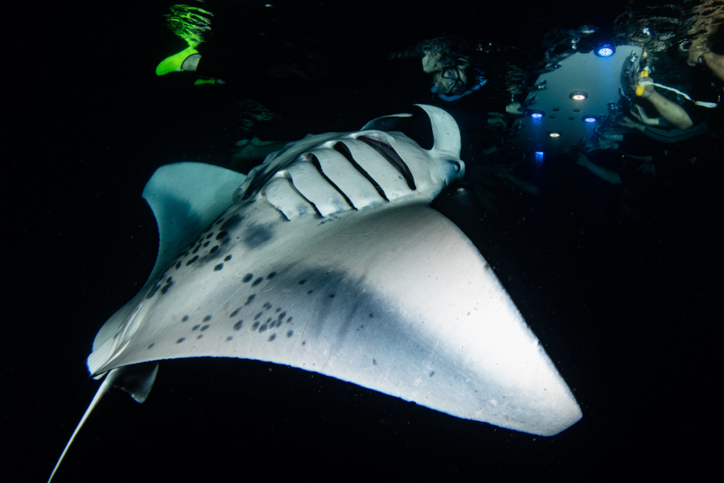 The first manta ray emerges from behind, rising from the dark waters below. Its 12-foot wingspan dwarfs me as it glides mere inches away—so close that I could stick out my tongue and lick it, which our guides specifically asked us not to do during the pre-tour briefing.