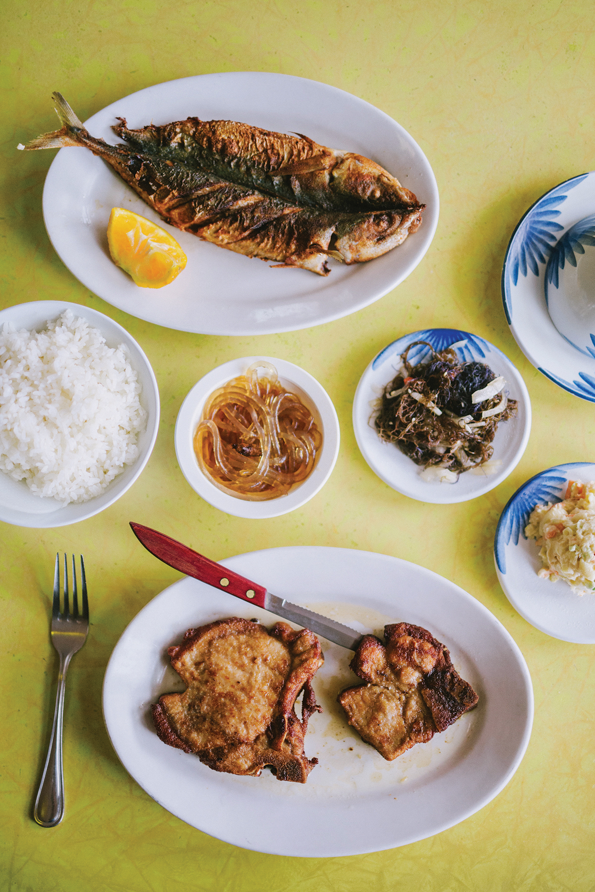 I took a friend recently to Manago, specifically for the pork chops, though she was enthralled by the rustic mac salad that came with the entrée. (The dish also comes with sides of cooked lima beans, corn and peas, and a big saimin bowl of white rice to share.) Here’s how it went.