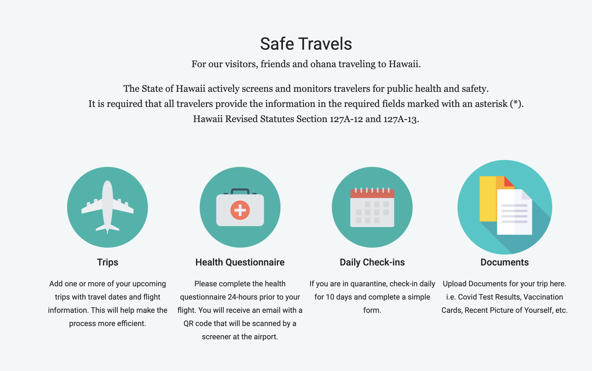 - Log onto the state’s Safe Travels Hawaiʻi portal. (See below.) Click on “Trips” and fill out your flight information. You MUST have your flight and hotel/accommodation information ready, including flight number and address of where you will be staying.